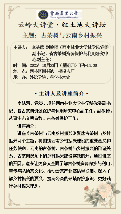 10月23日“云岭”大讲堂 “红土地”大讲坛:古茶树与云南乡村振兴