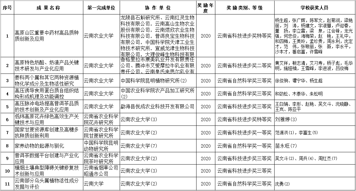 本站消息 2021年12月31日,2020年度云南省科学技术奖励大会在昆明海埂会堂举行,对推进我省科学技术进步、经济社会发展中做出突出贡献的科学技术人员和组织给予奖励。我校共获11项省科学技术奖,其中,我校作为第一完成单位获奖5项,包括特等奖1项,二等奖1项,三等奖3项;非第一完成单位获奖6项,包括特等奖1项、一等奖2项、三等奖3项,获奖数量位列我省高校第三,彰显了我校较强的科技成果竞争力。